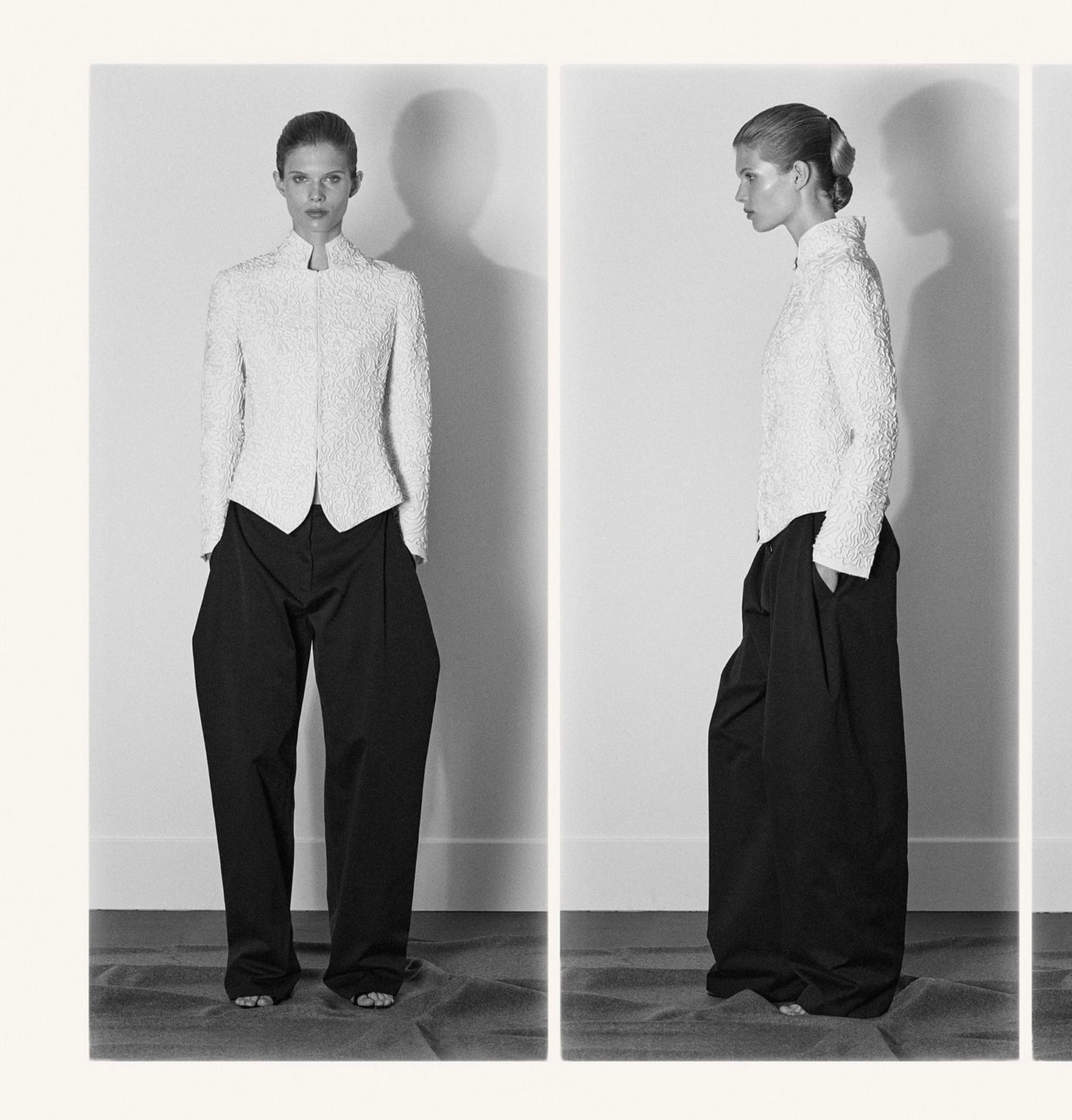 Evet, koleksiyon hazır giyimle couture’u karıştırıyor. Ama Martens, Galliano’nun aksine, sadece couture hayali kurmaktan zevk almıyor. Her gün giyeceğimiz kıyafetler ve onların nasıl “yeni” olabileceği üzerine de düşünceler geliştiriyor; yani Y/Project ve Diesel’deki yaklaşımını buraya getirdi. Trompe l’oeil oyunları ve kumaşla kurduğu o neredeyse deneysel ilişki, hacim ve oversize siluetlerle birleşti.