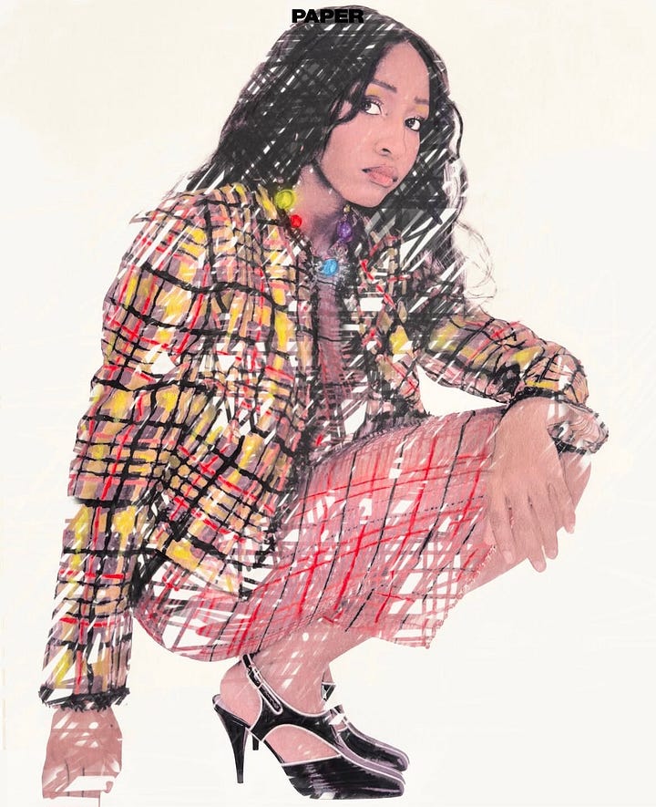 Birlikte çalışmaktan büyük keyif aldığım ve arkadaşım Zeynep Özkanca’nın dm’lerine kayıp tekniğini sordum. Müller’in yöntemi oldukça fiziksel. Neticede fotoğrafın baskını alıp boyuyormuş. Tekniğinin diğer bütün fotoğraflardan çok Ayo’nun tamamında Chanel giydiği çekimde kendini daha çok göstermesi de Matthieu’nun kıyafetlerinde yatıyor sanırım. Defilede look’lara uzaktan bakınca normalde tüvit gibi duran, ama yaklaştıkça aslında kare bulmaca gibi yukarıdan aşağıya ya da soldan sağa —Chanel’in websitesine göre “çoklu fiber” iplikler yeni bir yorum/siluet yaratıyordu. Yani Müller de sanki boyama kitabındaki boşlukları dolduran naif bir yerden yaklaşıyor gibi.
