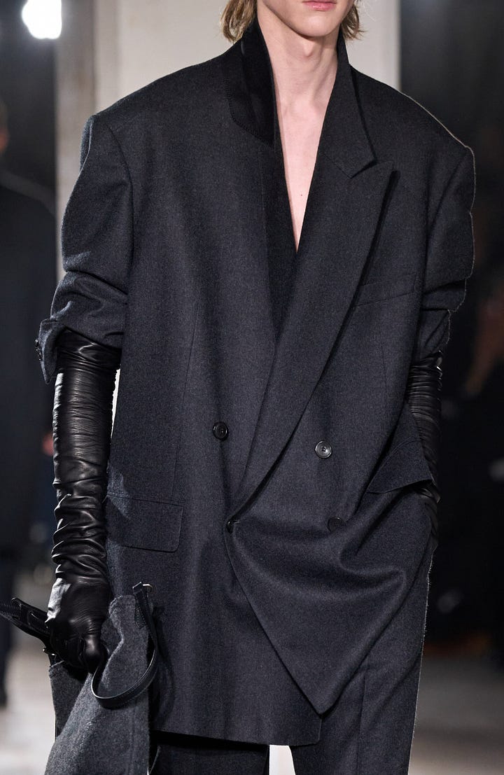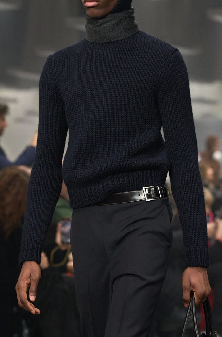 this season was largely dedicated to making rich people look richer. Tailoring was strident, and fabrics textured, with lots of cashmere and leather and fur — mostly fake or shearling, but very evident.