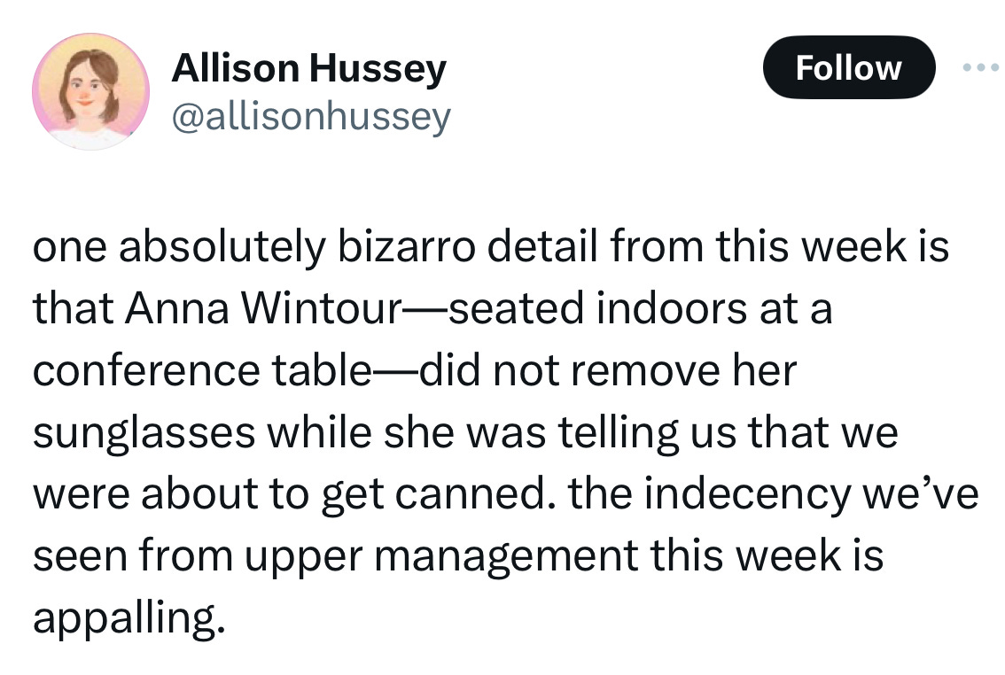 Singlehandedly dergiciliği dünyanın en cool ve insanlar tarafından merak edilen meslek haline getiren Anna Wintour, yine singlehandedly yayıncılığı sonlandırmak üzere yemin etmiş gibi. Bu hafta Pitchfork’u kapatıp GQ ile merge edeceğini duyurdu. Atılan bir tvite göre bunu açıklarken güneş gözlüklerini çıkarmamış bile. Hani şimdi eğri oturup doğru konuşalım son zamanlarda pek kimseler de Pitchfork için ölüp bitmiyordu ama… Özellilkle kadın ve pop müzik düşmanı gibiydiler. Bir taraftan da taa Will Welch’in ilk GQ sayısındaki edito’yu hatırlıyorum da orada, müzikle olan geçmişini, müziğe olan düşkünlüğünü ve erkek modası ve müzik arasındaki kurduğu paralelliği anlatıyordu. Ama yani komple bir müzik yayının yok edilmesini justify etmiyor bu.