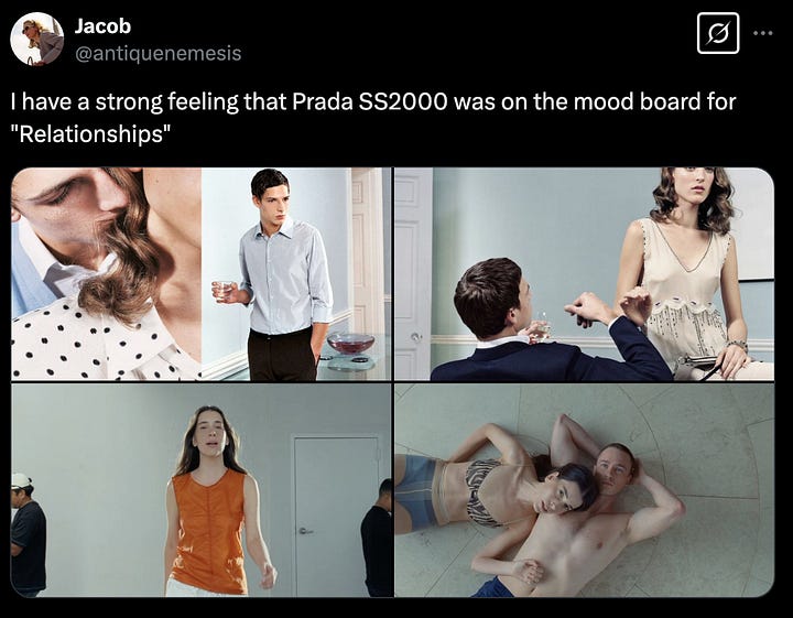 Videonun görsel dünyası, minimalist ama çarpıcı bir estetikle, 90’lar ve 2000’lerin başına ait moda ve sinema kodlarını keskin ve steril görsellikle harmanlıyor. Sanki Bauhaus etkili modernist mekanlardan, 70’lerin analog sıcaklığına uzanan bir hikaye akışı var. Soft focus ve doğal ışık kullanımıyla soğuk ama duygusal, mesafeli ama samimi. Prada, Helmut, Jil Sander ve Calvin estetiğinde.