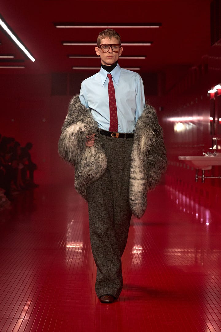 Teatrallik demişken: Alessandro Michele’nin koleksiyonunun başlığı “The Meta-Theatre of Intimacies”di. Adının önerdiği gibi teatral bir sunum ya da (homo)erotik yaklaşıma sahip bir yorumu da yoktu. Hani şok eden bir teatrallik ya da.Tuvaletlerde çok pis şeyler de dönebilir, Met Gala’nın perde arkasından sızdırılan o eğlenceli tuvalet anları da yaşanabilir. Ama burada? Ve ben artık bir modaevinin başına getirilen tasarımcıların yaptıkları look’larla, 32 sene önce üretilen benzer look’ları getirip “işte tasarımcının yeni yorumu” başlığını görmekten de sıkıldım. zaten yapıldı????