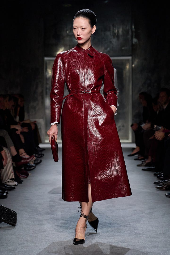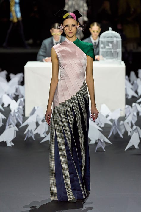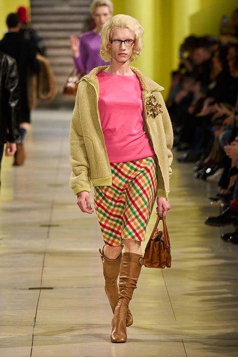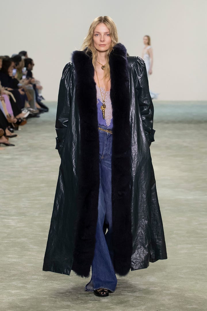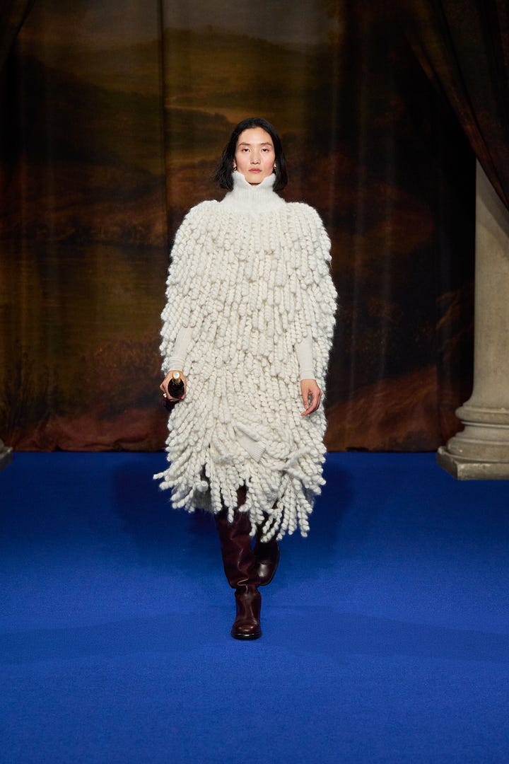 Özellikle şu iki look. (Substack’in imajları anlamsız şekilde kesme olayından nefret ettiğimi de belirteyim.) Grimm masalarından fırlamış gibi duran karakterler. Ama böyle az sonra sarayda kralın huzuruna çıkmadan önce bakırımsı bir küvette beyaz bez parçalarına bocalanan gül suyuyla vücudunu silecekmiş gibi duran look’la, Almost Famous’ın 1970’te Paris’te çekilen versiyonu gibi look. İki favorim.