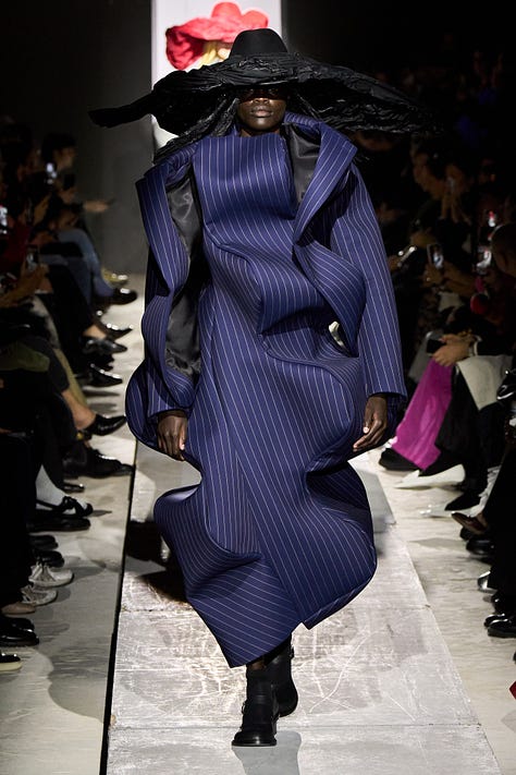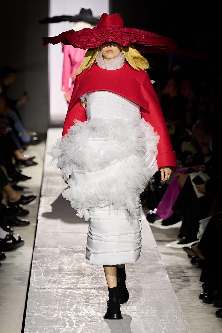 her iki koleksiyonun ortak noktası da büyük hacimli fikirleri görmemizdi. fall 25 koleksiyonları için taze fikirlerin olmadığı sıkıcı sezon diyenler de vardı. bense uzun süre sonra bir harmoni içinde inanılmaz güzel kıyafetlerin geçişini izlediğimiz bir dört hafta olarak görüyorum. çoğu zaman sakin, yer yer sıra dışı olsa da giyilebilir kıyafetlerin resmi geçidi. ama bu iki sezon önceki “gerçek kıyafetler” gördük temalı yaklaşım gibi değil, hani ilk kıvılcımı proenza defilesinin açılış look’unda yakaladığımız o süper sakin normalliğin olduğu sezon. bu kez bir başkaydı. tüm teatrilliğine rağmen comme des garçons defilesinde bile giyilebilir kıyafetler vardı.