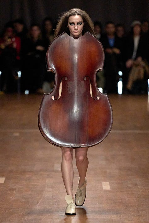 Vuitton’u izlerken sürekli böyle bir şey hayal ettim aslında, çalgılarını yerleştirebilmeleri için tasarlanan enstürman çantaları bile vardı. Nepo baby, Fransız burjuva çocuklarının sanat okuluna giderken kullanmaları için herhalde.