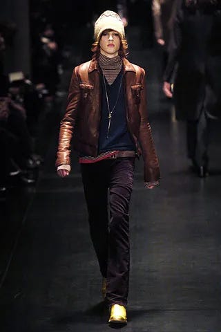 Hedi’nin zengin züppe, burjuva genç Celine’ini saymazsak, Dior Homme’daki 2000 ortası siluetleri de benzer bir noktada hele ki Sonbahar/Kış 2005 “Luster” koleksiyonu.