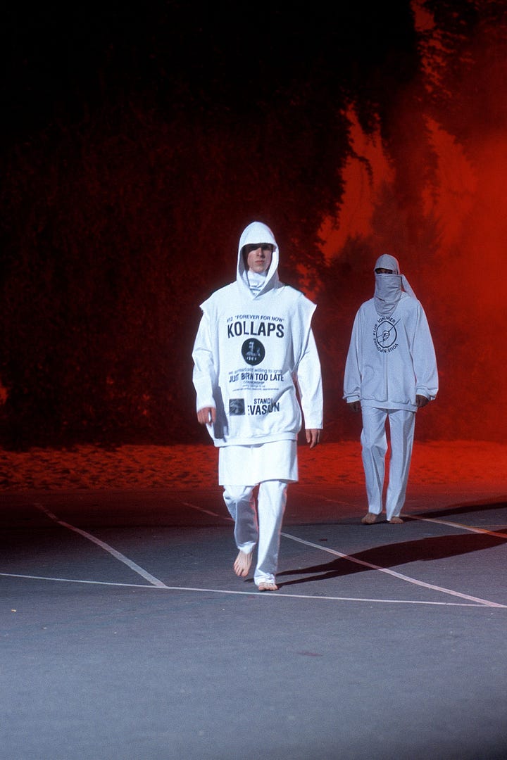 Fonda Kraftwerk ve New Order çalarken queer sokak çocukları, gençlik isyanı, kırılganlık ve dışlanmışlık… (ki zaten simons koleksiyonlarının genel havası). Raf, Amerikan gençlik kültürüne, bağımsız filmlere ve fotoğrafçılığa olan ilgisini zaten her seferinde söylüyor ama nedense geriye dönüp direkt bi calvin koleksiyonu ve parçası aradım. (taktım!!!!!)