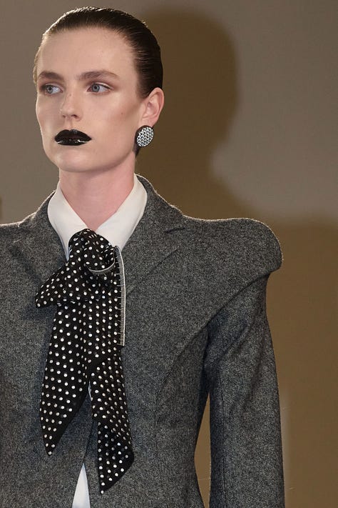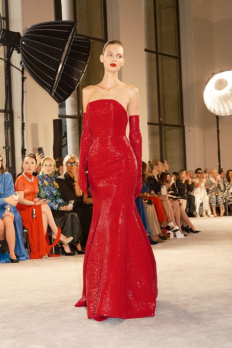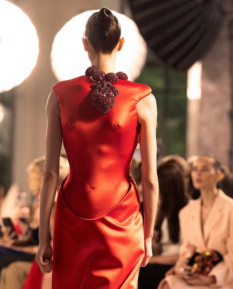 tamamıyla siyah-beyaz(gibi) olan koleksiyonun orta yerinde üç kırmızı elbise vardı. defileyi ön sıradan izleyen kişi ise dua lipa. sanki roseberry dua’nın royal albert hall performanından en az benim kadar etkilenmiş ve ondan ilham alarak tasarlamış gibi. aksi halde neden… kırmızılardan ilki can yakan güzellikte sanırım yarı transparan, revenge dress’in daniel’cesi gibi, bir diğeri cate blanchett, michelle yeoh ya da nicole kidman sınıfından bir oyuncunun oscar’ını kucaklarken giymek isteyeceği türden, en sonunucusu ise daniel’in oyunu. ters yüz edilmiş bir korse elbise gibi, göğüsler ve gövde sırt tarafında ve orada bir kalp atıyor. defilenin konuşulmaya değer tek yanının mesela vogue runway’de slayt’larında olmayışı insanın garibine gidiyor.