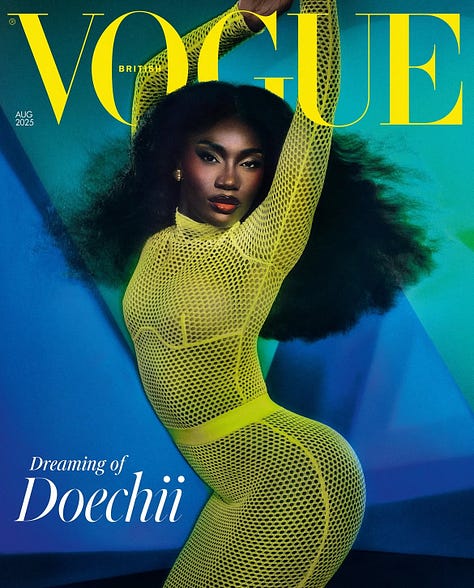gucci’nin bütün kapakları aldığı bahar 2024 sayılarından sonra sahne givenchy’de sanırım. doechi ve anne hathaway sırasıyla vogue uk ve usa’in ağustos kapağında. sayılarının hepsinin fanı olmadığımı rahatça belirtebilsem de chioma’nın vogue uk için muazzam kapak isimleri seçtiğini inkar edemiyeceğim. kaldı ki yanılmıyorsam bu doechi’nin ilk dergi kapağı. böyle bir adım atmak cüret ister. yılın en hype’lanan ismini göz ardı etmek de cüret ister. anne hathaway konusunda ilginç olansa versace ve valentino’yla adı çok fazla anılan, hatta onların reklam yüzü olan bir kadının full givenchy koleksiyonuyla fotoğraflanmış olması. belli ki satın alınmış bir iş; tam da bu yüzden sarah burton’ın favori kızlarından birinin yer almasını tercih ederdim.